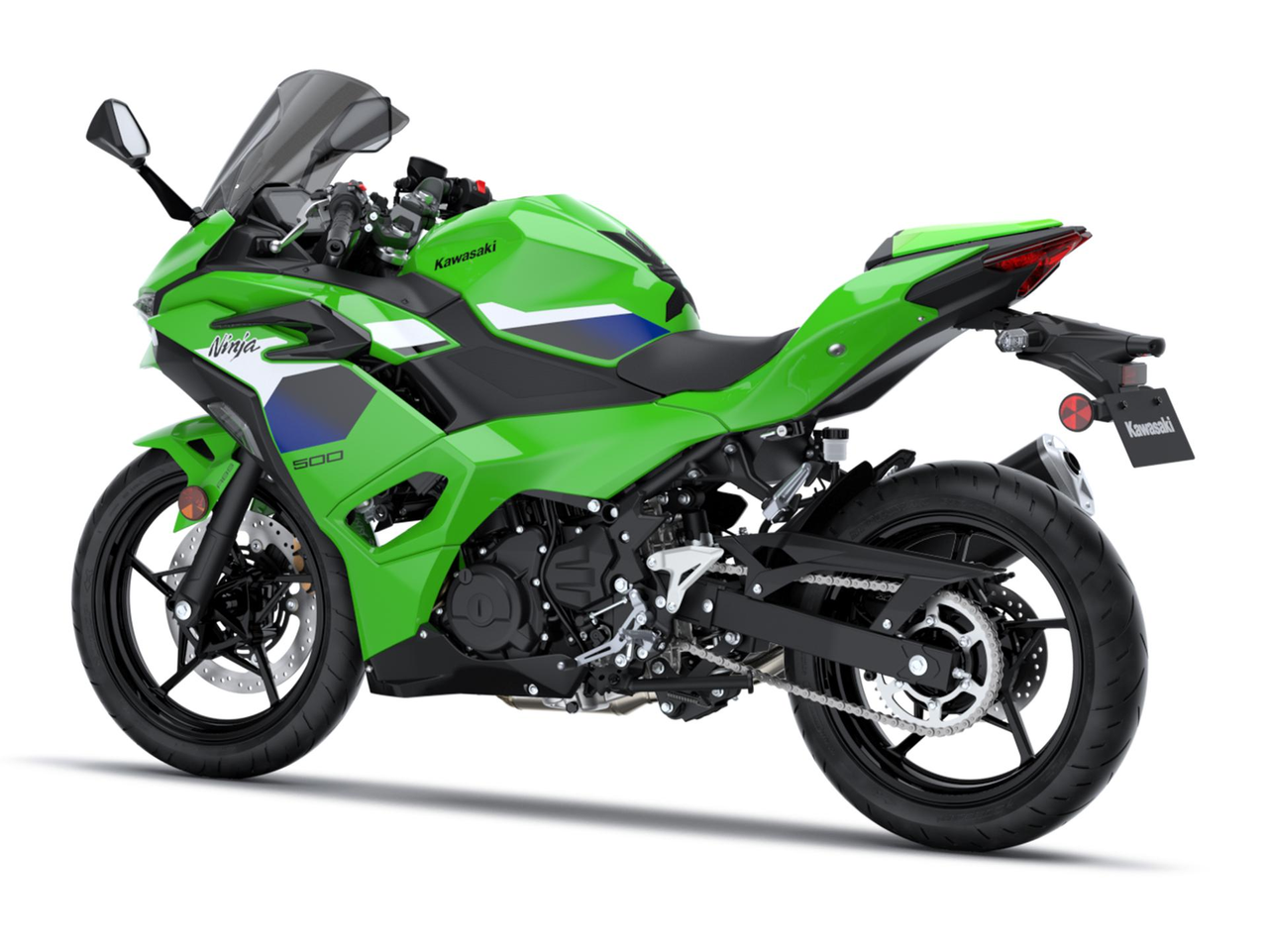 The Ninja 500’s “face” is based around two newly designed compact headlights. Below them two spoilers protrude forward and complete the striking look.
