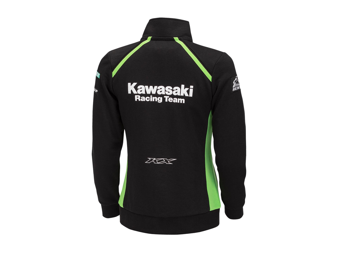 Sweatshirt zippé femme MXGP 2024 Ouverture et poches exterieurs zippés. Hanches et poignets bord cote Logo Kawasaki et KX brodés Badges des logos sponsors brodés 80% coton 20% Polyester