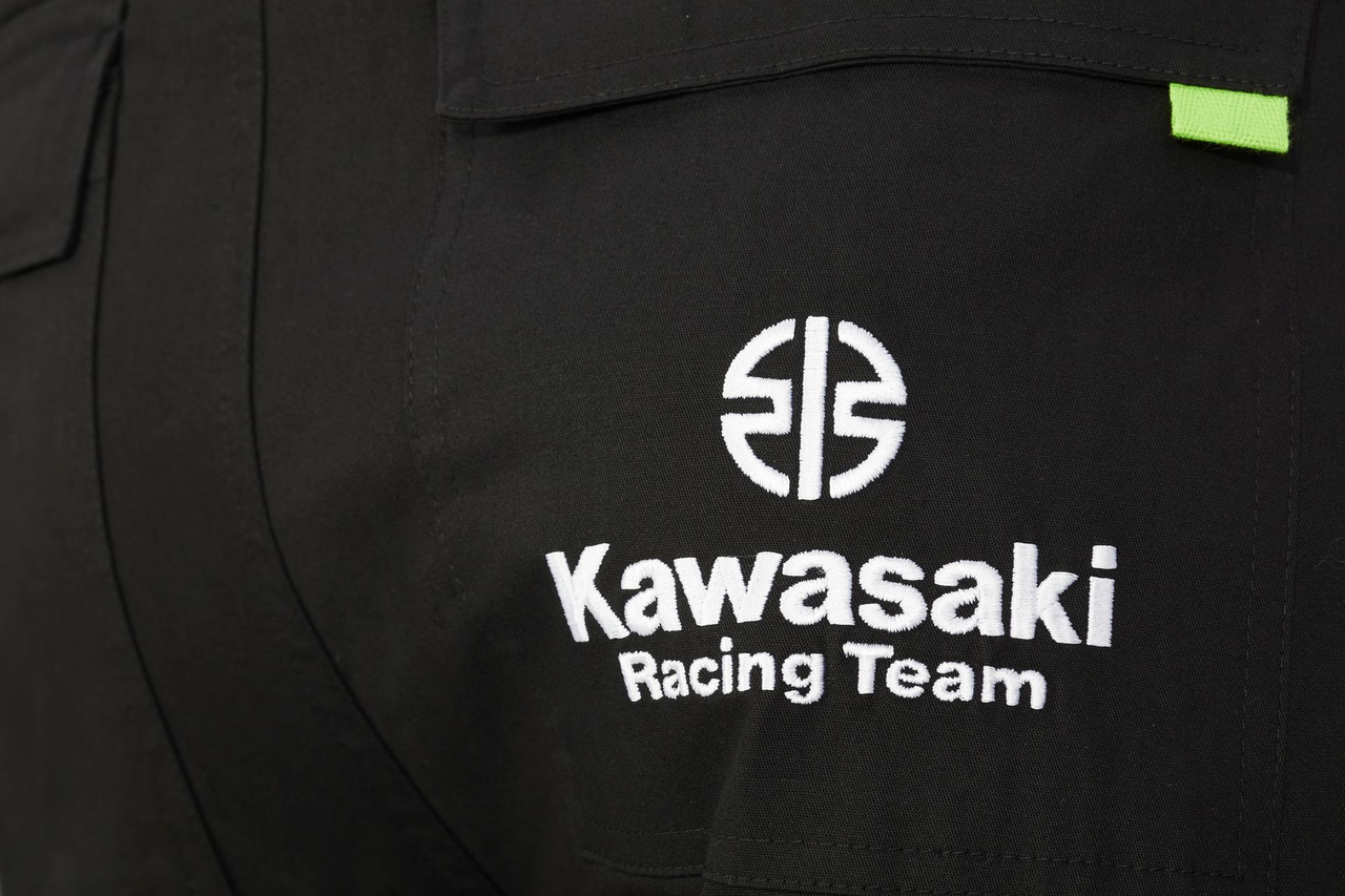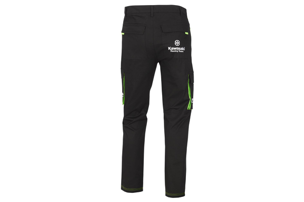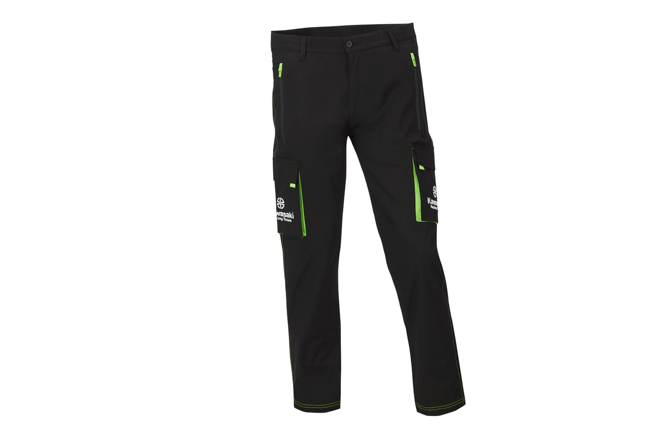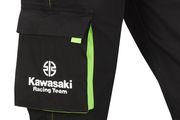 Pantalon long style cargo. Poches avant zippées Poches latérales style cargo Poche arrière avec rabats Logos de course Kawasaki 97% coton 3% élasthanne