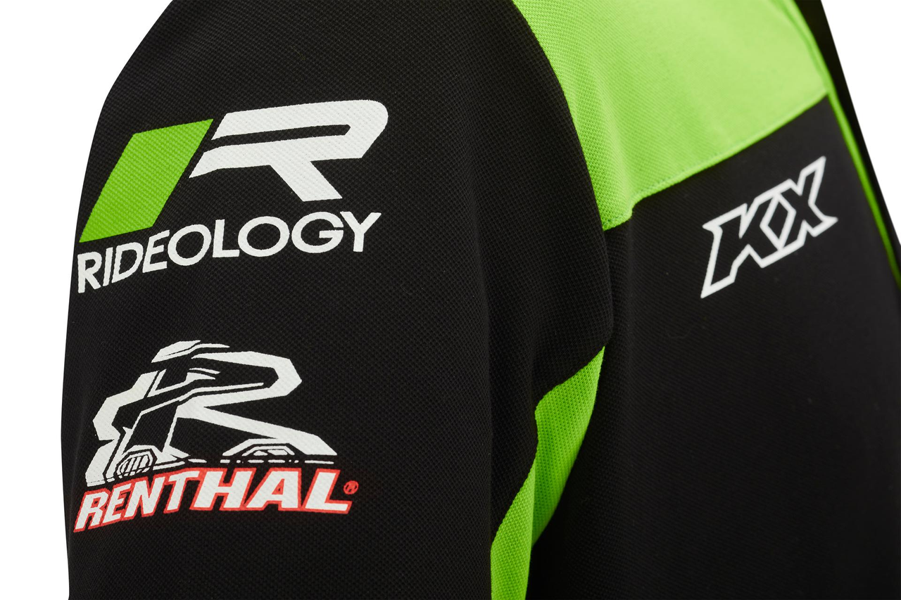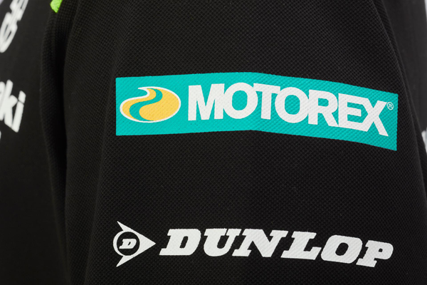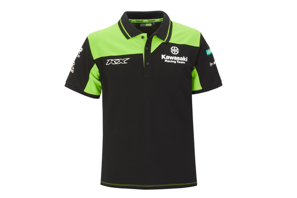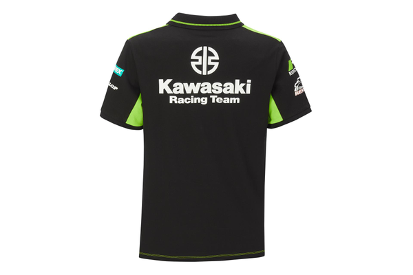 Polo vert et noir Kawasaki à manches courtes avec encolure à 3 boutons et manches à revers. Logos de course et de sponsor Kawasaki Tissu piqué 95% polyester 5% élasthanne