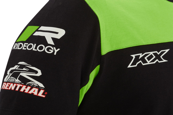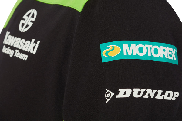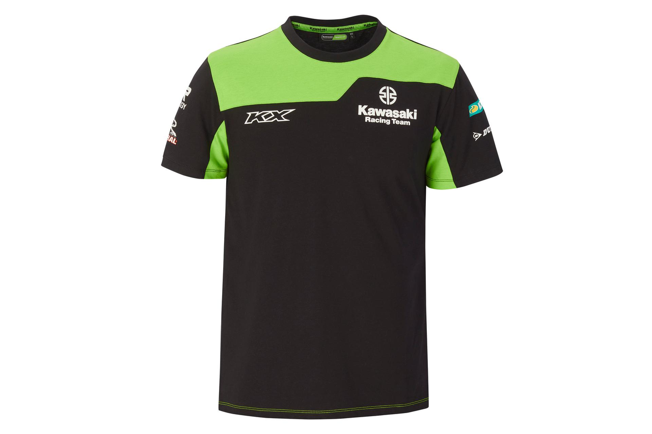 T-shirt Kawasaki vert et noir, ras du cou, manches courtes. Logos de course et de sponsor Kawasaki Tissu à maille unique 50% coton 50% polyester