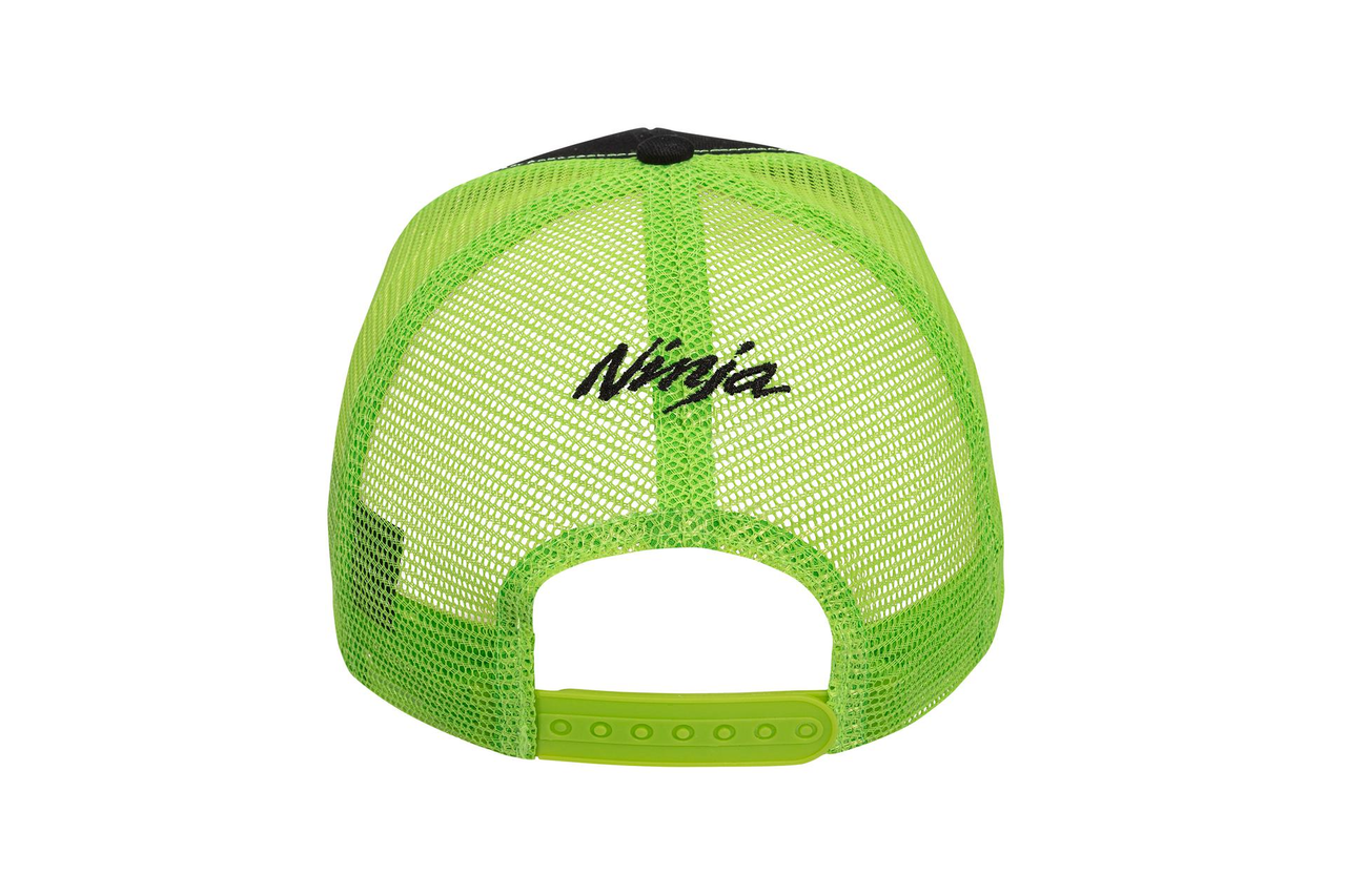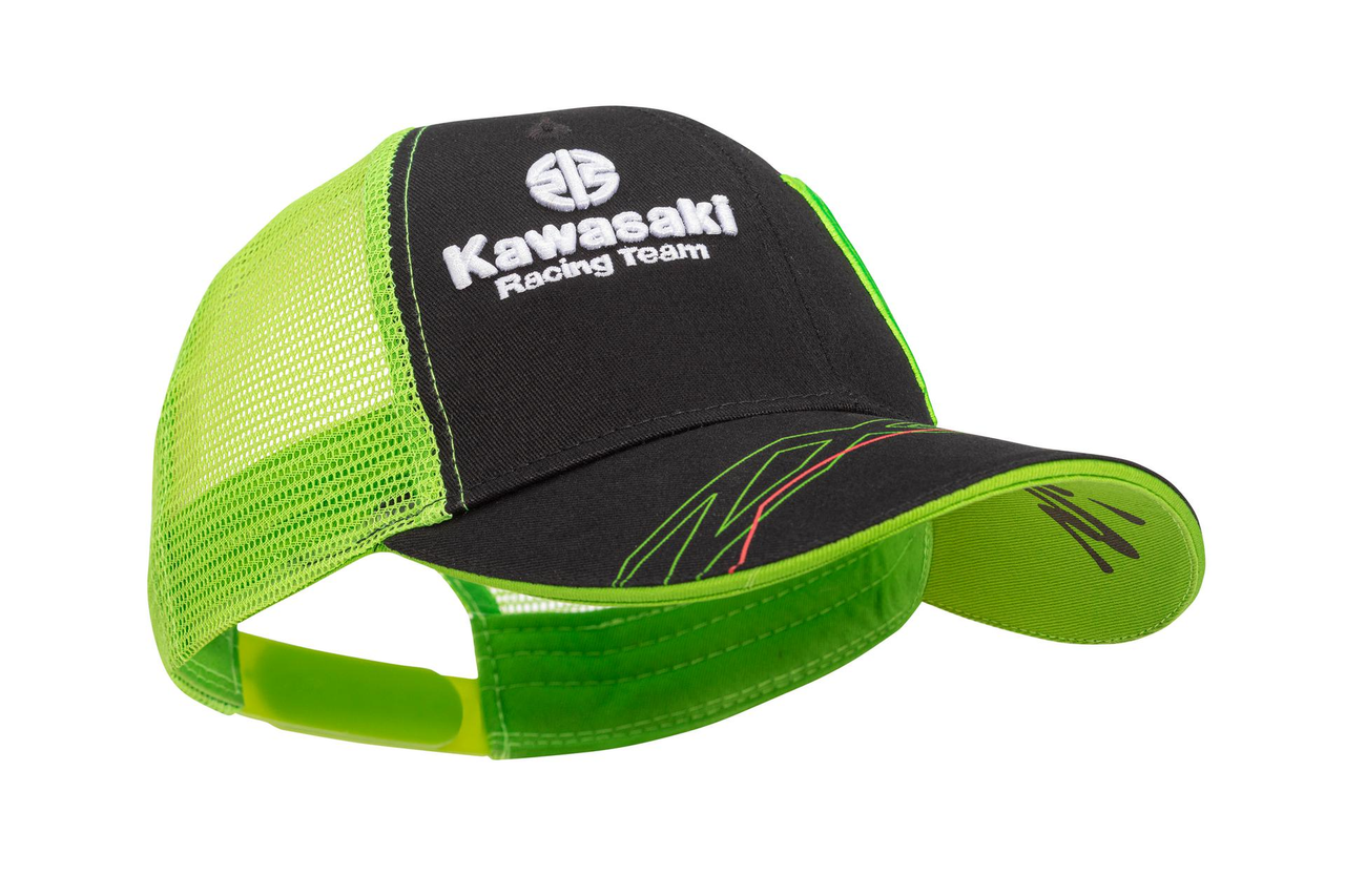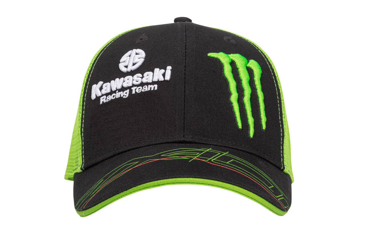 Casquette à visière à six panneaux aux couleurs de l'équipe WSBK 2023 de Kawasaki Sangle réglable Logos de course Kawasaki et Monster Energy Devant en sergé (noir) dos en maille (vert) 100% Coton