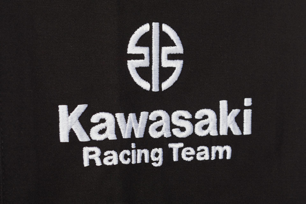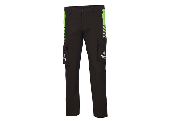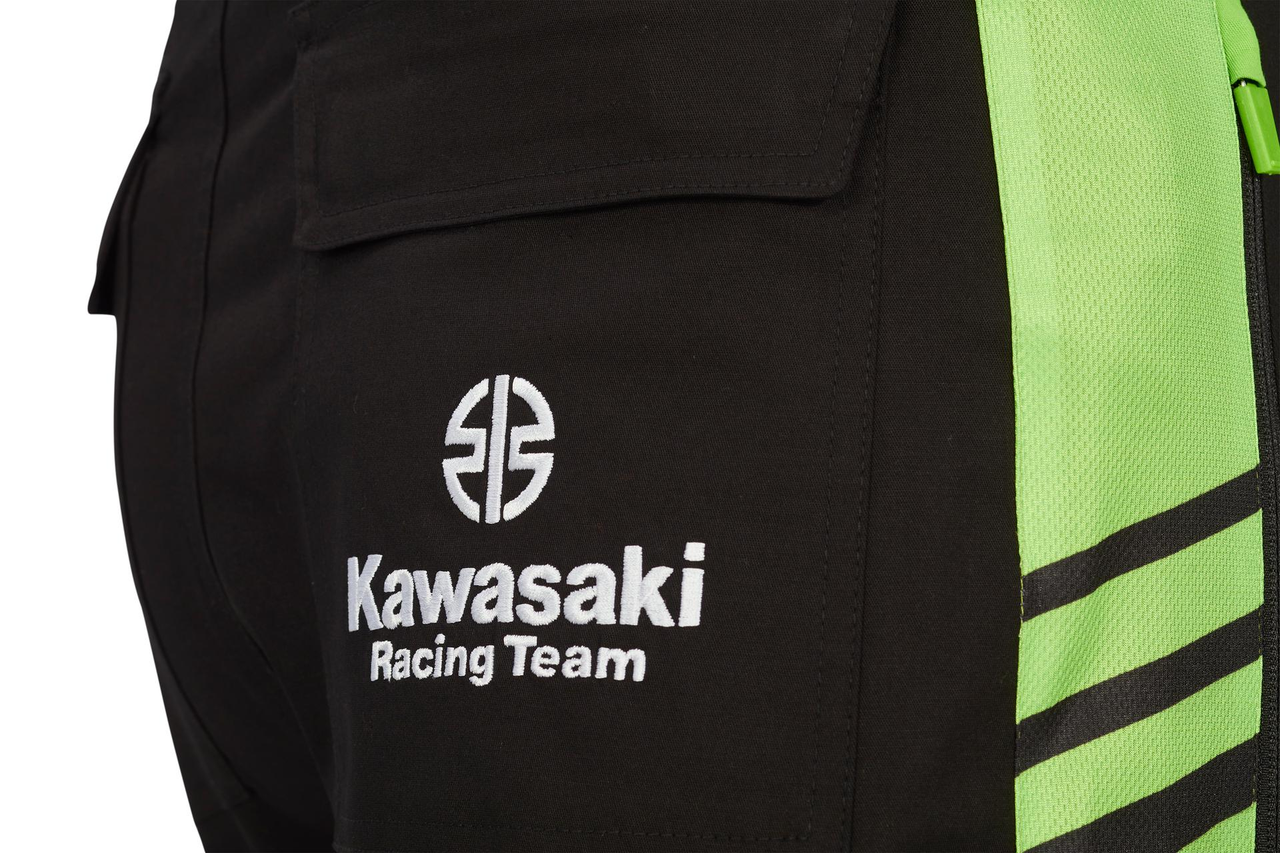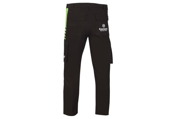 Pantalon style cargo Poches avant zippées Poches sur les jambes style cargo Poche arrière avec rabats Logos de course Kawasaki Tissu sergé 97% coton 3% élasthanne