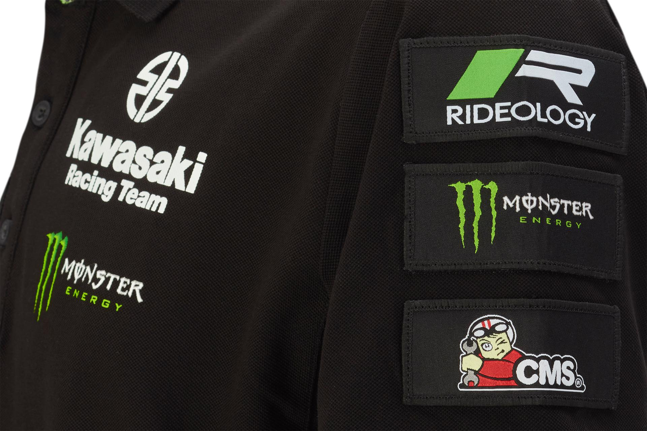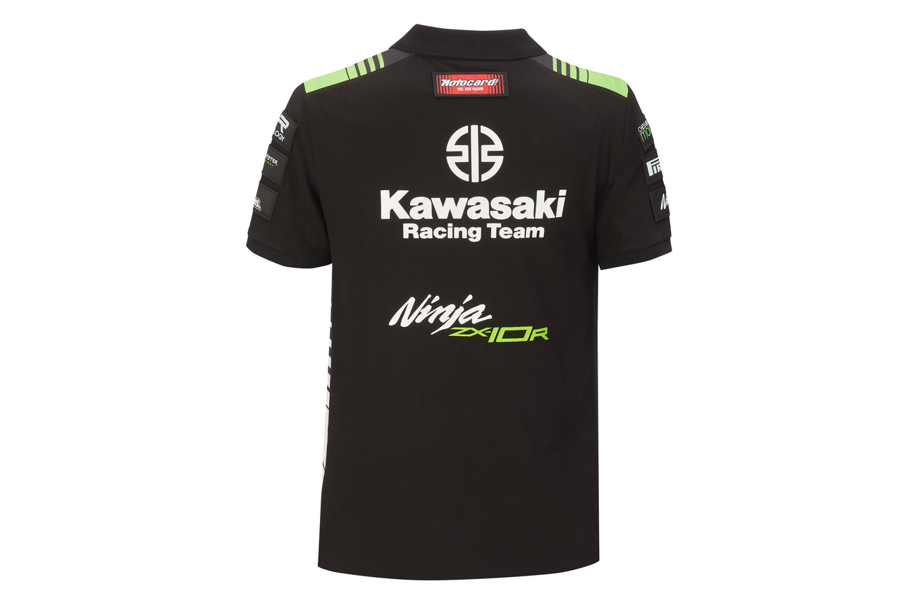 Polo à manches courtes aux couleurs de l'équipe Kawasaki WSBK avec col à 3 boutons et manches à revers. Logos de course et de sponsor Kawasaki Tissu piqué 95% polyester 5% élasthanne
