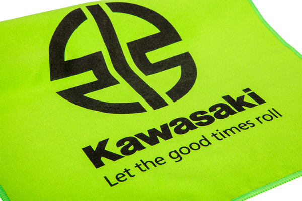 Serviette de sport en microfibre de marque Kawasaki, vendue avec son sac de rangement.