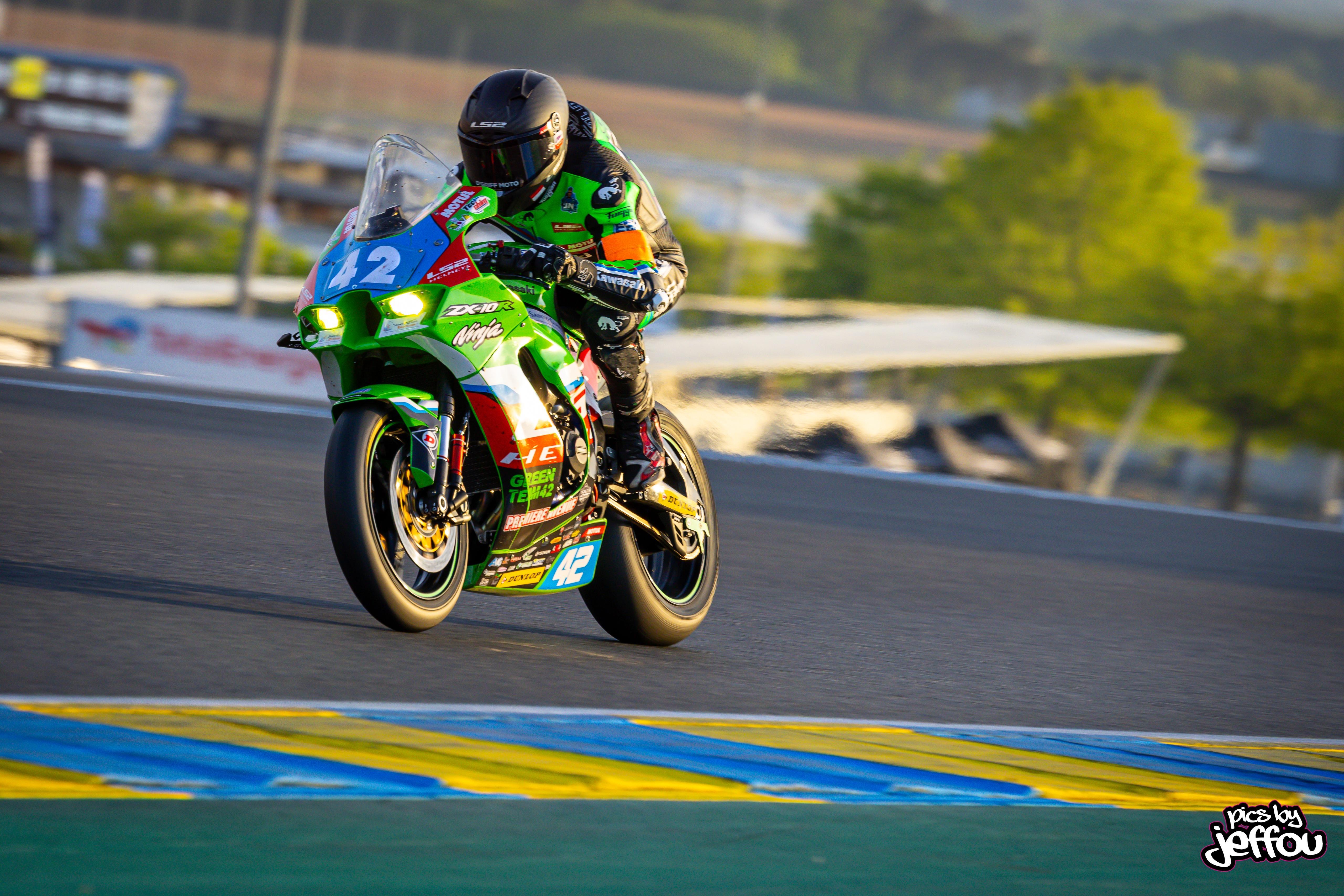 Qualifiée en 2ᵉ position de sa catégorie, la Kawasaki #42 s’élance depuis la 43ᵉ place au général, avec Jules Blanc au guidon pour le départ. Très vite, le ton est donné : dès la première heure, la machine verte prend la tête de la catégorie Production.
