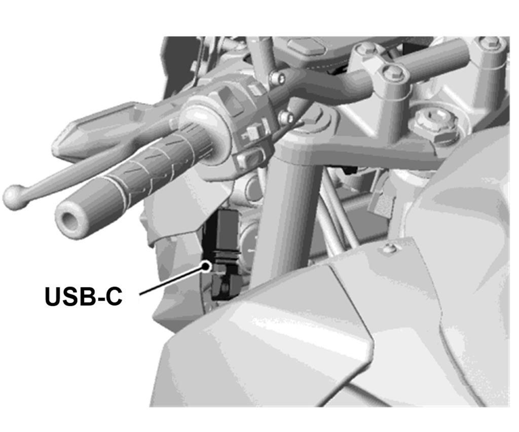 Prise USB-C résistante à l’eau montée à côté du capot du phare. La puissance maximale totale est de 3 A.