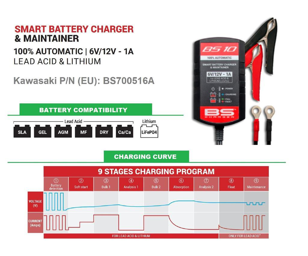 Pour garder votre batterie en bon état pendant les mois d'hiver et prendre un nouveau départ au printemps, Kawasaki propose un chargeur de batterie intelligent compact. Le chargeur de batterie intelligent Kawasaki peut charger et entretenir les batteries traditionnelles au plomb, au gel et les nouvelles batteries Lithium/LiFePo4.