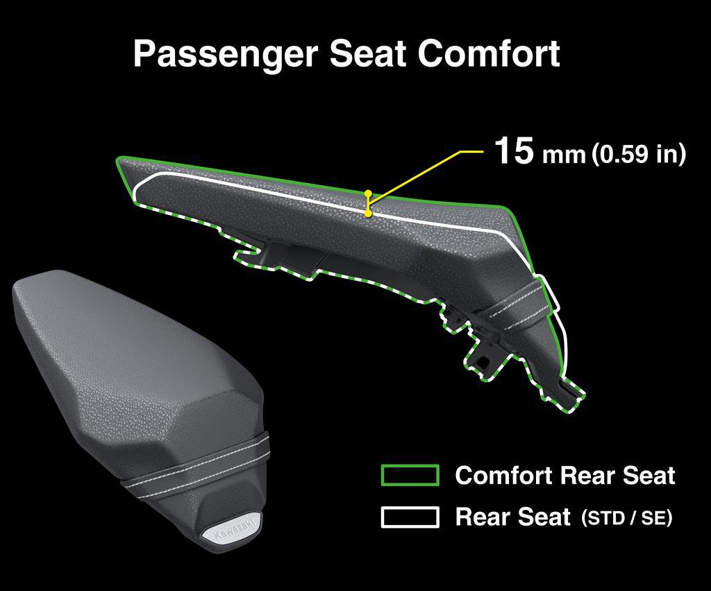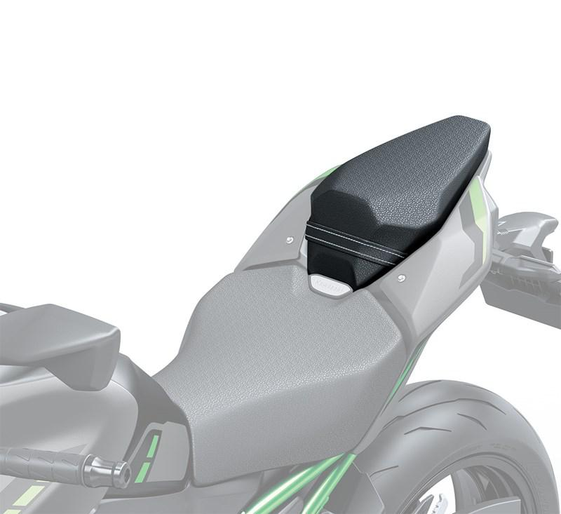 Selle passager allongée et rehaussée de 15 mm pour un confort accru lors des longs trajets. Arborant le logo Kawasaki en aluminium.