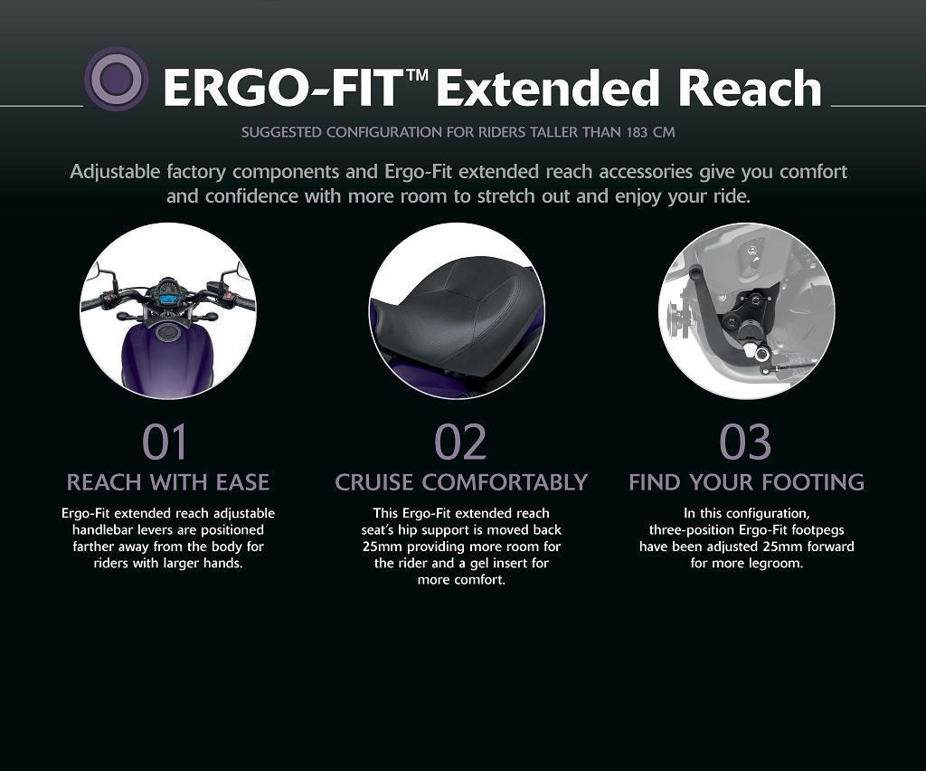 Les composants d’origine réglables et les accessoires ERGO-FIT Extended Reach offrent davantage d’espace pour le pilote, améliorant confort et confiance sur la route.