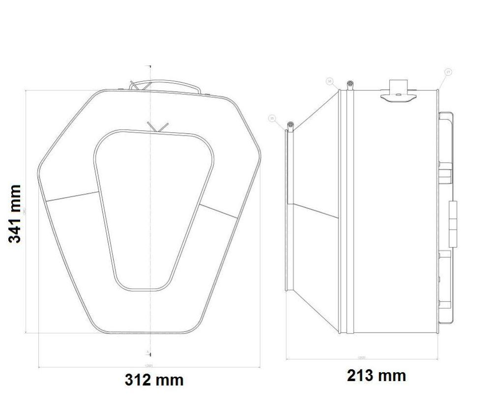 Long. 312mm, larg. 213mm, hauteur 341mm (par côté), Charge maxi 3kg (par côté) Capacité de charge approximative 14L (par côté) (Largeur du système 815mm)